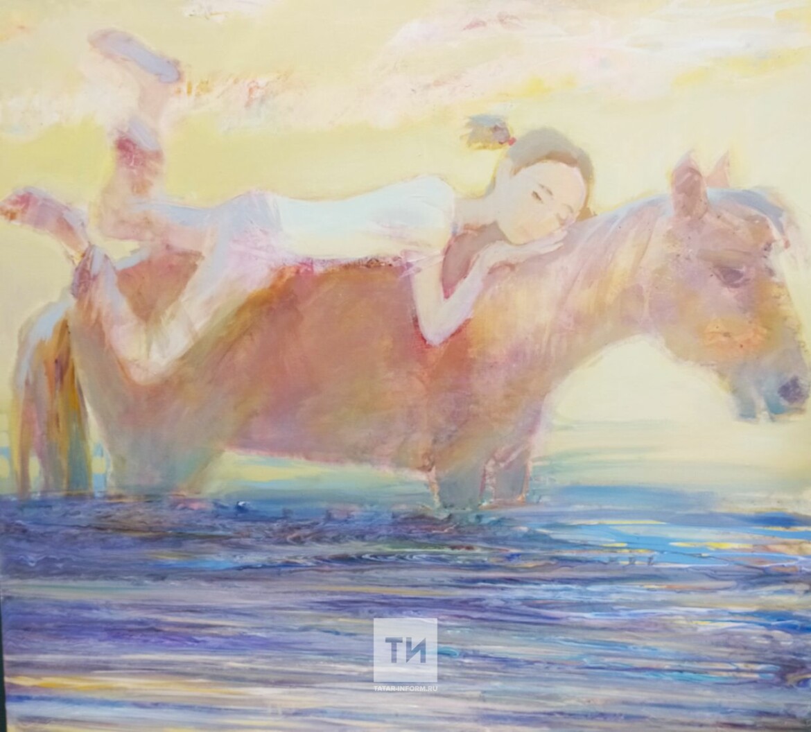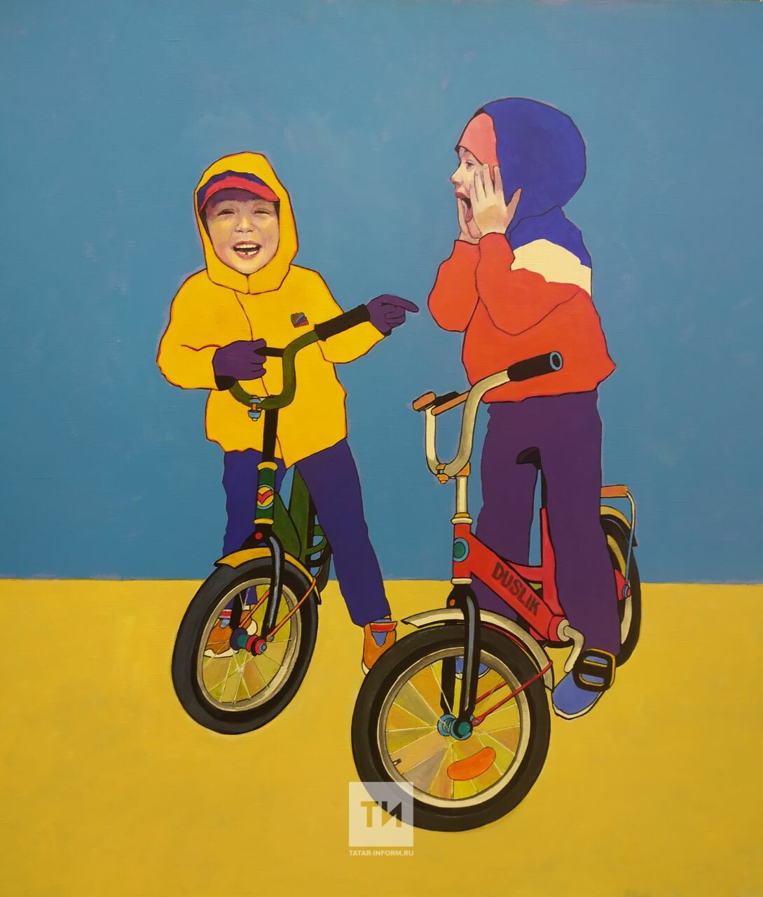 Для выставки Гильманов предоставил несколько своих любимых работ. Среди них — яркая картина «Дуслык», изображающая его сына на велопрогулке с другом. «Это картина про праздник детства. Про ежедневный праздник», — сказал художник.