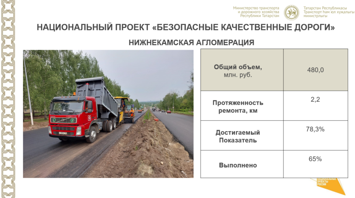 По Нижнекамской агломерации в рамках нацпроекта ремонтируется 2,2 километра, объём выполнения составляет 65%. Финансирование – 480 млн рублей.