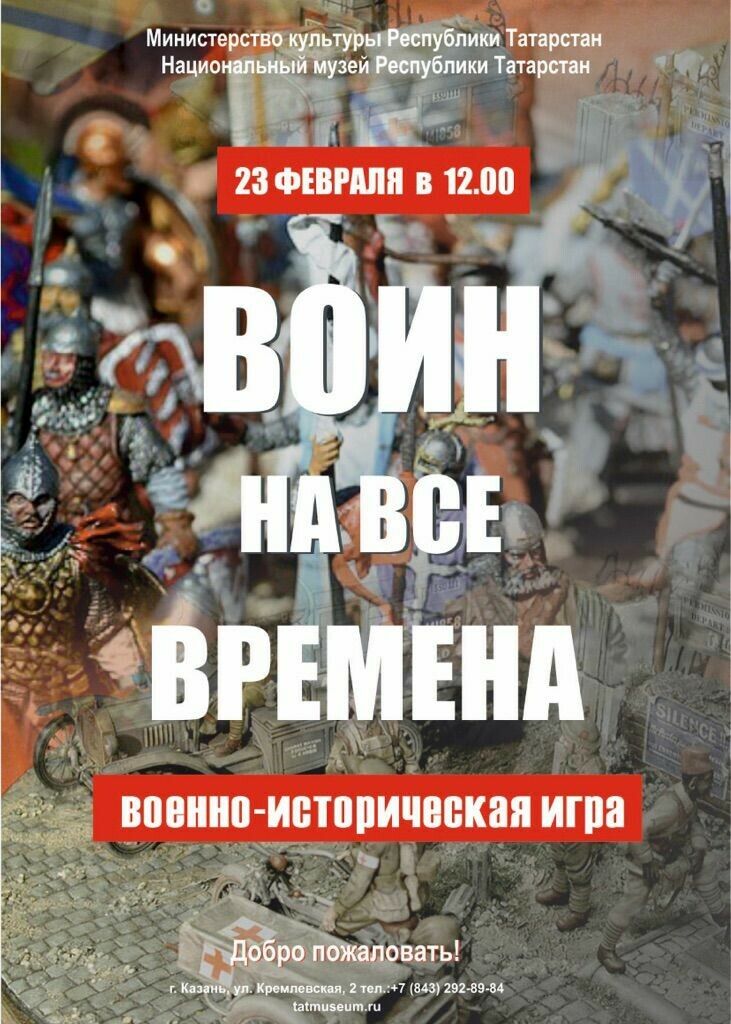(Казань, 21 февраля, «Татар-информ»). 23 февраля в Национальном музее Татарстана состоится праздничная программа «Воин на все времена». Для всех защитников вход в музей в этот день будет бесплатным, сообщает пресс-служба музея.