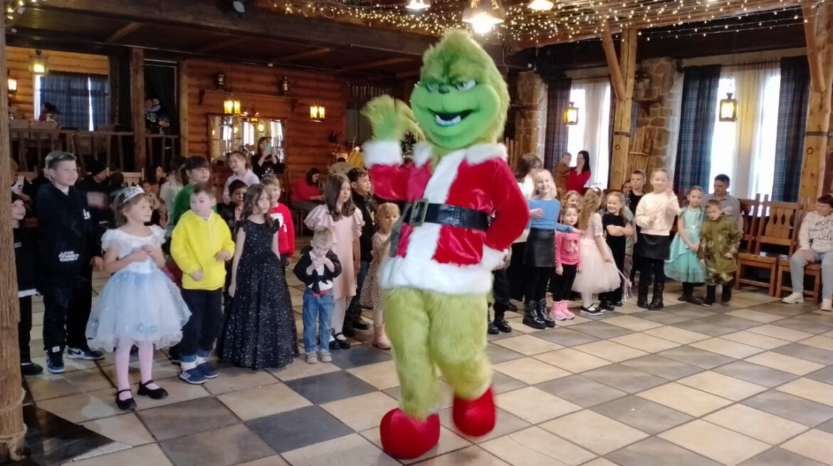 Поздравить малышей вышел известный новогодний персонаж Гринч. Дети встретили его с восторгом. Кроме него, в праздничном представлении участвовали гномы и другие сказочные существа.