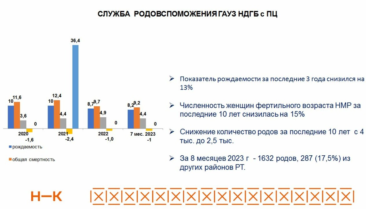 «Рождаемость за восемь месяцев в нашем районе составляет 8,2 промилле, она снижется с 2021 года. Младенческая смертность за восемь месяцев — 3,7 случая на 1 тыс. детей, родившихся живыми, и это ниже, чем показатель прошлого года. Однако целевая цифра Минздрава РТ (2,8) нами, к сожалению, пока не достигнута», — рассказал Толстиков.