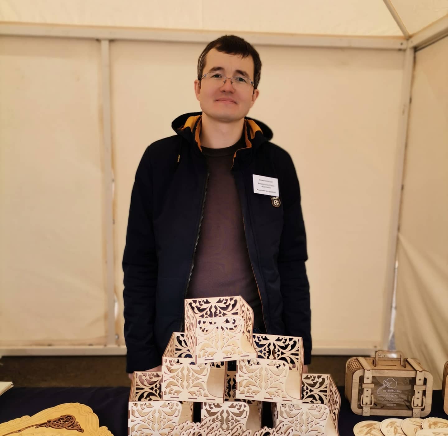 Риаз Хайруллин подготовил для ярмарки сувениры, игры для детей, календари, разделочные доски, элементы декора. Также он занимается изготовлением фоторамок, ключниц, карт мира, всё это делая из дерева. Очень много товаров мастер изготавливает на заказ, клиентов находит через социальные сети и там же вдохновляется новыми идеями.