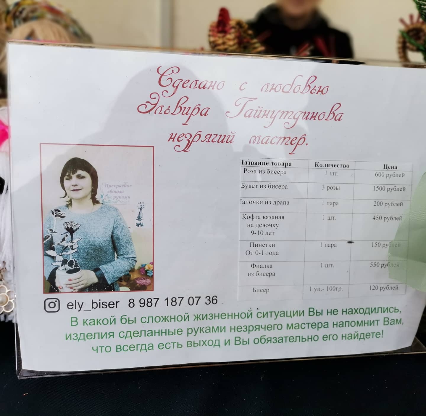 Продукция каждого из мастеров по-своему уникальна. Например. самозанятая Эльвира Гайнутдинова представила на ярмарке изделия из бисера и вязаные вещи. Ей 47 лет, 17 лет назад она потеряла зрение. При этом женщина-инвалид работает социальным педагогом в Центре реабилитации слепых и воспитывает дочь Веру. Эльвира очень любит мастерить. «С помощью творчества я выражаю свои эмоции, состояние души», — говорит она.
