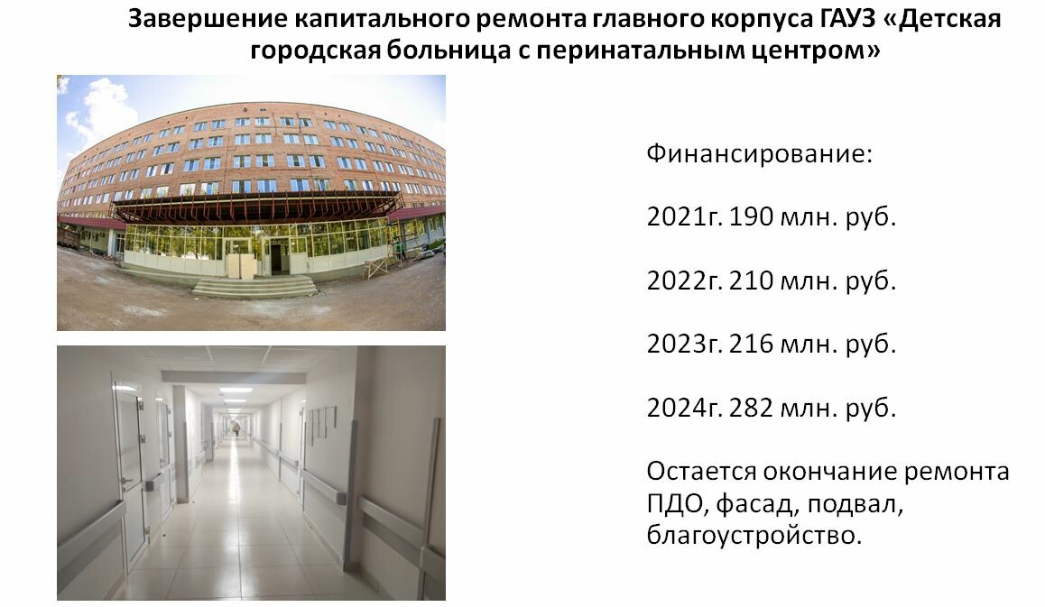 Кроме того, на этот год запланировано завершение капитального ремонта главного корпуса ГАУЗ «Детская городская больница с перинатальным центром» на улице Менделеева. Объем финансирования — 282 млн рублей.