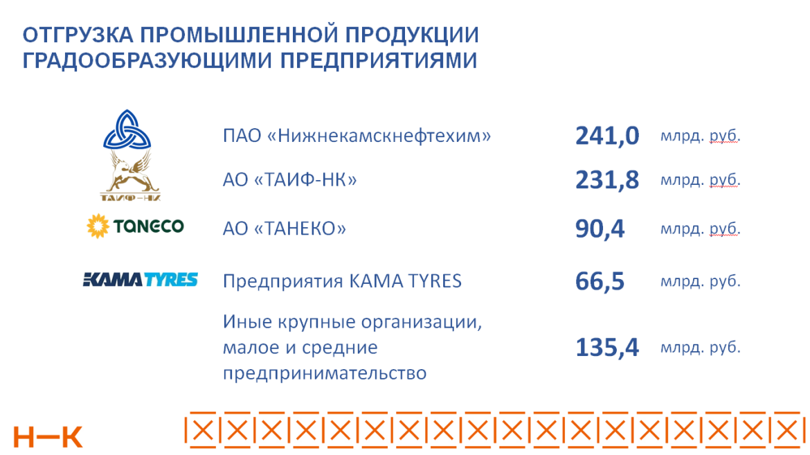 Основное влияние на показатели социально-экономического развития территории оказывает деятельность градообразующих предприятий, таких как ПАО «Нижнекамскнефтехим» (СИБУР), АО «ТАНЕКО», АО «ТАИФ-НК», предприятия KAMA TYRES, в планах которых предусмотрен значительный прирост промышленного производства, в том числе за счет ввода новых мощностей в результате реализации масштабных инвестиционных проектов.
