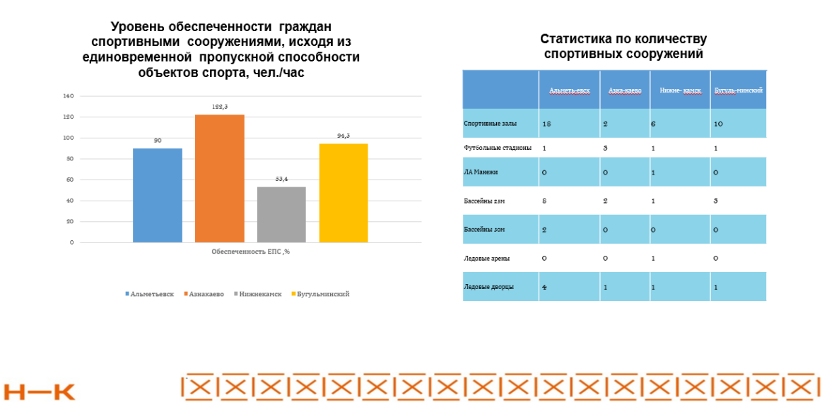 В Нижнекамском районе работает 661 спортивное сооружение, из которых 15 объектов являются специализированными. Это два плавательных бассейна по 25 метров, два ледовых дворца, одна ледовая арена, один легкоатлетический манеж, один футбольный манеж, один футбольный стадион, семь отдельно стоящих спортивных залов.