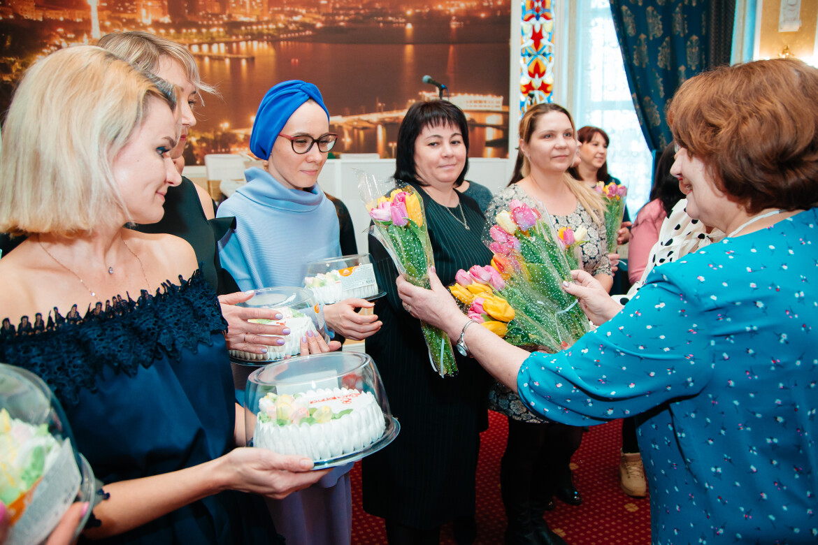 По окончании мастер-класса мамы пообщались друг с другом за праздничным столом. Каждая женщина получила сладкие подарки и букет цветов.