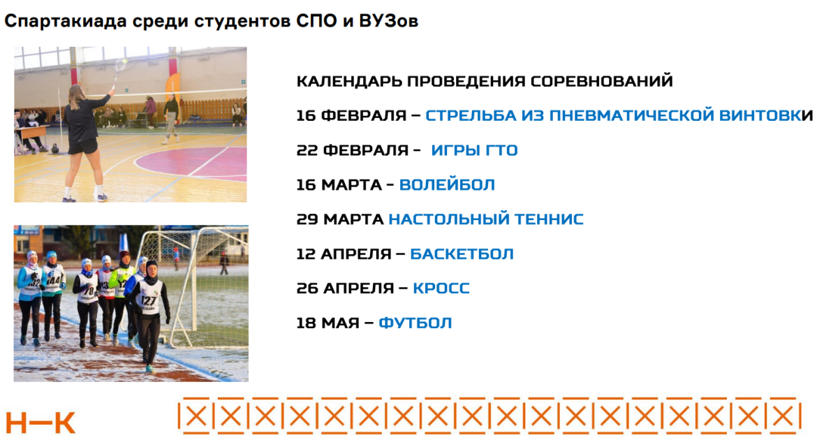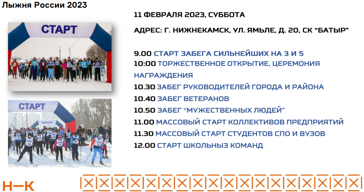 5 февраля в спортивном комплексе «Дружба» пройдет традиционный фестиваль единоборств с участием бойцов со всей страны, за которым можно будет наблюдать онлайн. 11 февраля — традиционная акция «Лыжня России», которая по всему району ежегодно собирает более 5 тыс. любителей зимних прогулок. А для матерых спортсменов подготовлен Нижнекамский лыжный марафон, который состоится 26 февраля в лесном массиве возле спортшколы «Батыр».