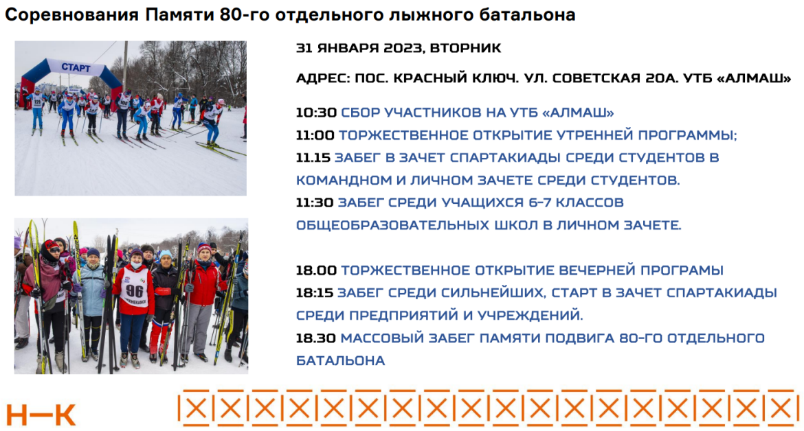 31 января состоится лыжная гонка на базе учебно-тренировочной базы «Алмаш» в честь подвига 80-го отдельного лыжного батальона. Соревнования включат в себя как и вечернюю, так и утреннюю программу.