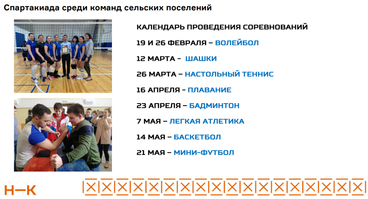 Продолжат свою работу, но еще в более масштабном формате Спартакиады среди коллективов предприятий учреждений, в ней сформирована лига для коллективов среднего и малого бизнеса. Также на ряду с предприятиями спартакиады проводятся и среди команд сельских поселений «Саламетлек» и студенческого сообщества. Победители всех видов Спартакиады в своих группах сойдутся на супер финале, который запланирован на 22 сентября.