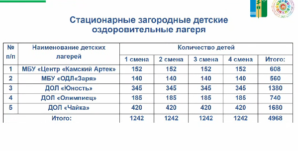 «Лагеря начнут работать с 1 июня», — уточнила Камелина. Среди них — «Камский Артек», «Заря», «Юность», «Олимпиец» и «Чайка».