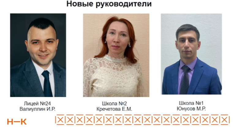 Так, директором школы №11 стал Сергей Михайленко, школы №31 — Олег Щербаков, лицей «Адымнар» возглавил Артур Галиахметов, лицей №24 — Ильяс Валиуллин, школу №2 — Елена Кречетова, школу №1 — Марсель Юнусов.