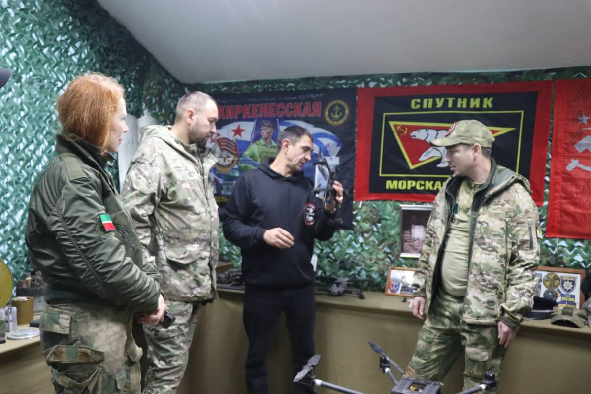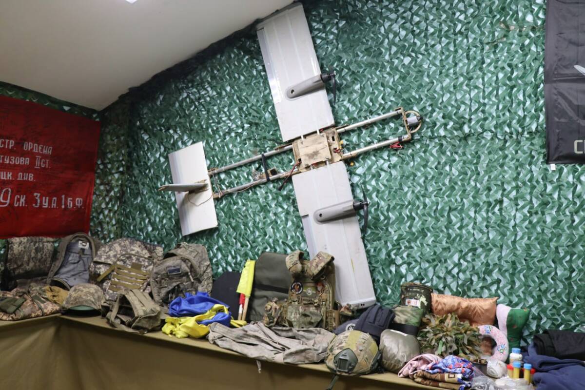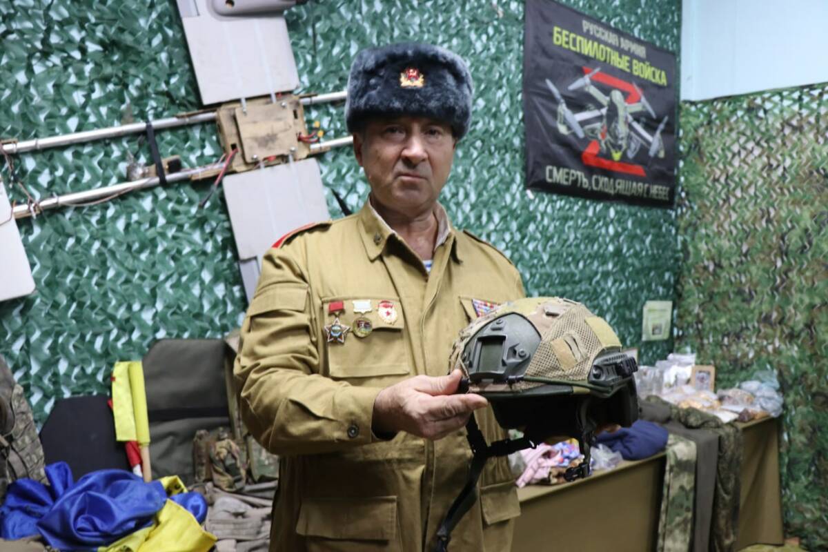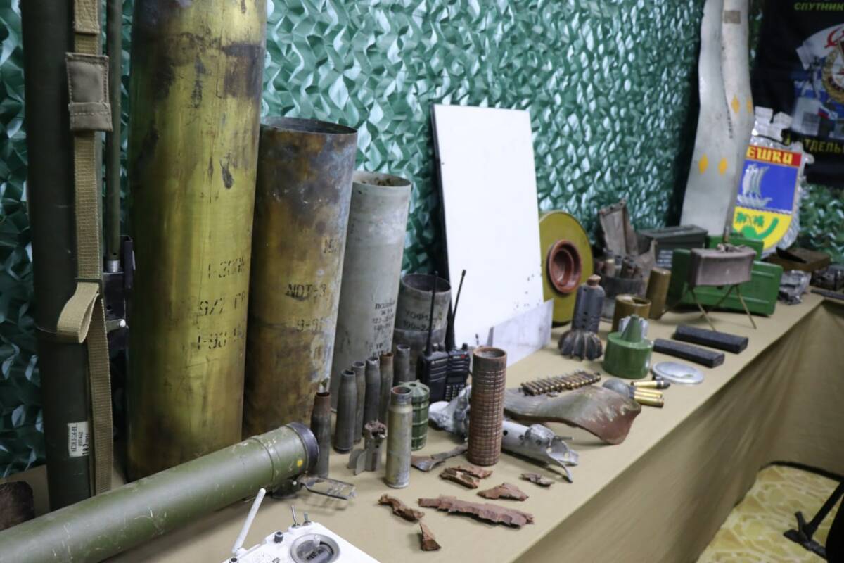 Руководитель пункта Рафаэль Зиганшин показывает на карту, висевшую когда-то на вражеском дроне. «У каждого экспоната своя история. Вот эта карта была прикреплена к вражескому дрону. Противник отметил место дислокации наших военнослужащих, отправил ее вместе с дроном, мол, мы знаем, где вы находитесь. Но он не достиг своей цели. Наши бойцы сбили дрон, и сейчас он вместе с картой хранится у нас в музее» , – говорит он.