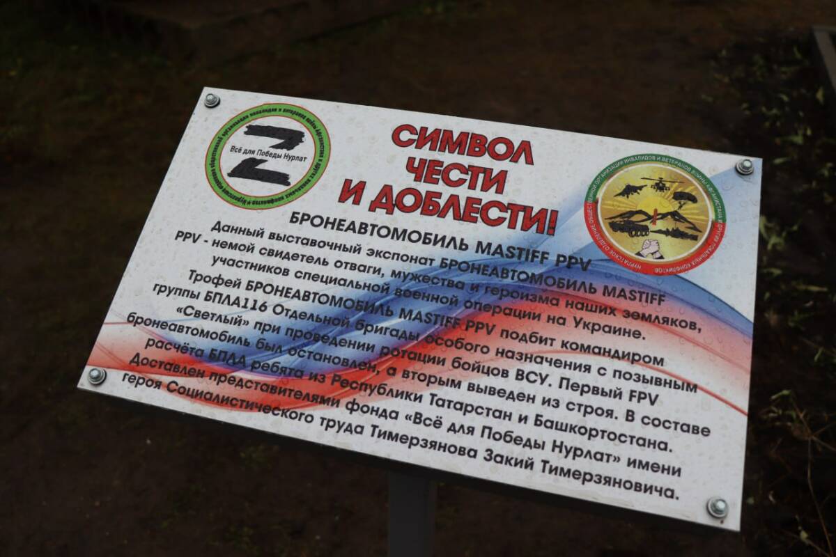 В этот же день на 9-м километре автодороги Нурлат – Бурметьево открылась выставочная площадка под открытым небом – в месте, где обычно делают остановку дальнобойщики и туристы. На площадке стоит огромный британский бронеавтомобиль Mastiff – трофей, подбитый бойцами 116-й отдельной бригады особого назначения.