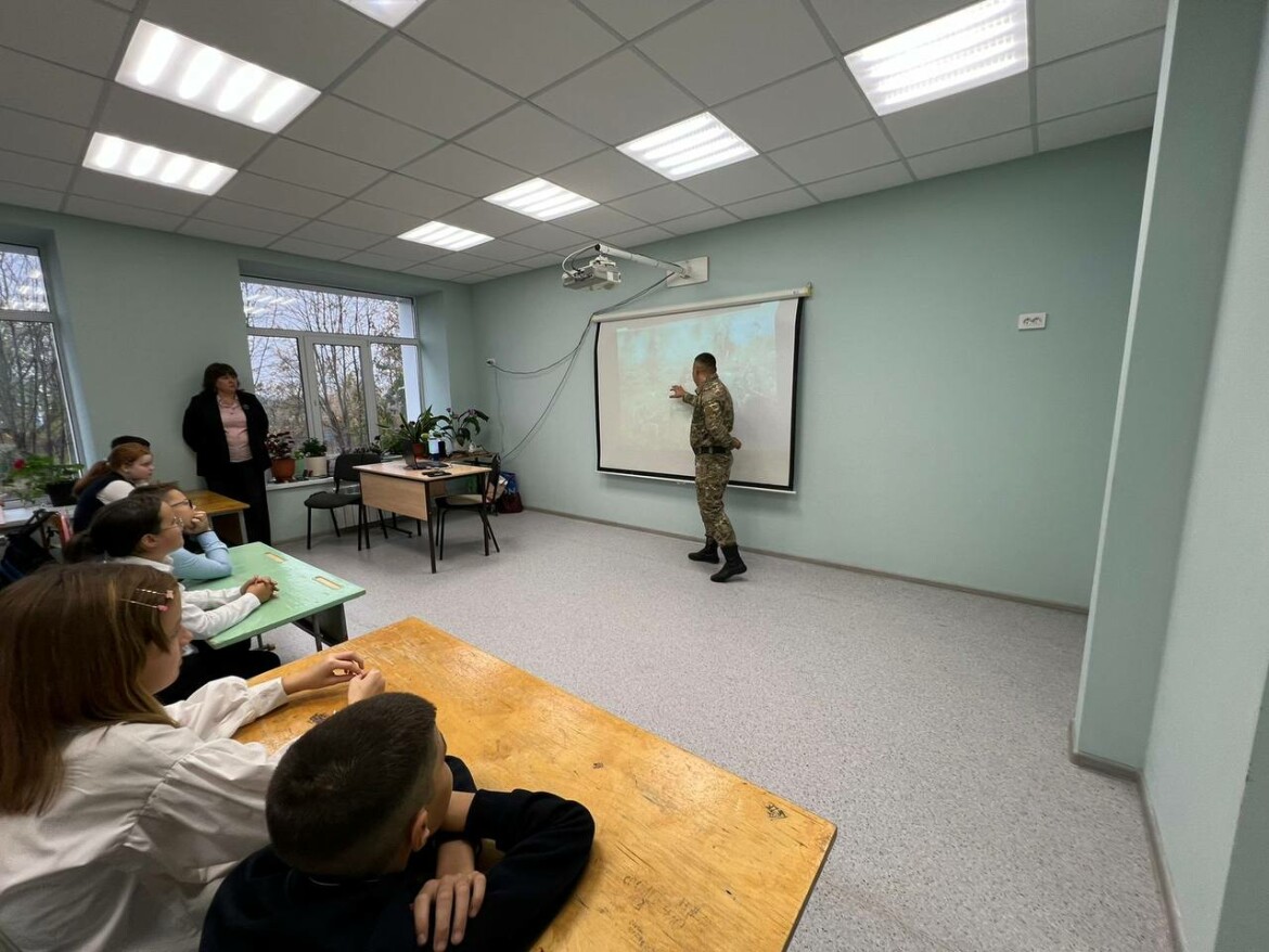Ученики внимательно слушали военного и задавали ему интересующие их вопросы. А тот делился разными историями из своей военной жизни. Затем дети подарили бойцу сувениры: рисунки и поделки, сделанные своими руками.