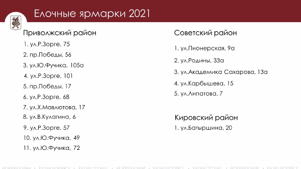 В Приволжском районе будут работать 11 елочных городков, в Советском — пять, один — в Кировском, по два — в Вахитовском и Авиастроительном, четыре — в Ново-Савиновском, в Московском — три.