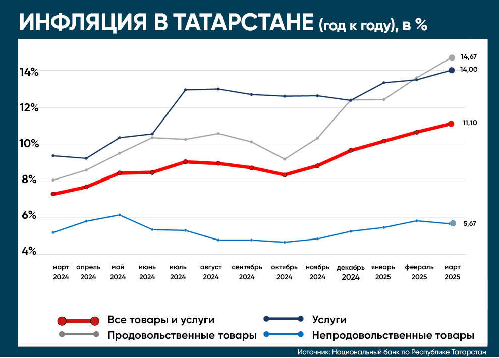 Годовая инфляция в Татарстане в марте 2025 года выросла до 11,1%. Это снова выше, чем по России (10,34%) и ПФО (10,68%). В Нацбанке РТ ускорение объяснили тем, что в республике заметнее росли цены на продукты питания и услуги. Подробнее – в очередном обзоре «Татар-информа».