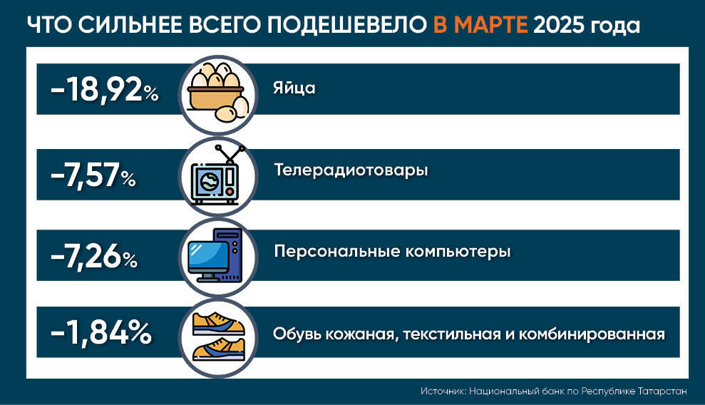 В Нацбанке РТ отметили, что на эти колебания отчасти повлияло более заметное снижение цен на яйца, так как птицефабрики Татарстана произвели их больше, чем в феврале. В то же время меньше, чем в среднем по стране, у нас подешевела техника, прежде всего смартфоны, что «может объясняться более высокой активностью покупателей», заявили в регуляторе.