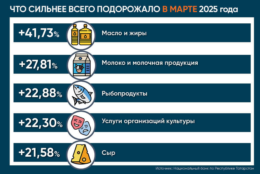 Годовая инфляция в марте в Татарстане не просто ускорилась, но и оказалась выше, чем в целом по стране (10,34%), поскольку у нас «заметнее увеличился годовой прирост цен на продукты питания и услуги, особенно на молочную, рыбную и мясную продукцию, а также на медицинские и бытовые услуги», кратко объяснили в Нацбанке РТ.