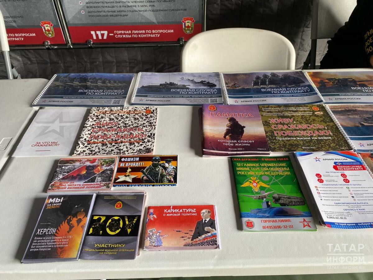 Сегодня в палатке представлен не только стандартный набор брошюр, но и множество увлекательной литературы. Здесь можно найти журналы с полезными советами для бойца-контрактника, небольшую книгу с политическими карикатурами и многое другое.