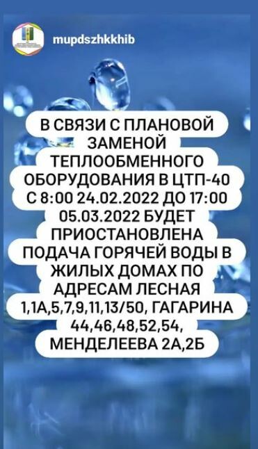 С сегодняшнего дня с 8 утра и до 17.00 5 марта горячей воды не будет в домах № 1, 1А, 5, 7, 9, 11, 13/50 по улице Лесная; № 44, 46, 48, 52, 54 по ул. Гагарина и 2А, 2Б на ул. Менделеева.