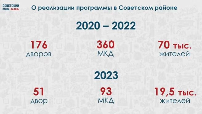 В целом за все годы реализации программы в Советском районе благоустроили 176 дворов, улучшения затронули 70 тыс. жителей. В этом году в проект вошел еще 51 двор, где в 93 многоквартирных домах проживают почти 19,5 тыс. человек.