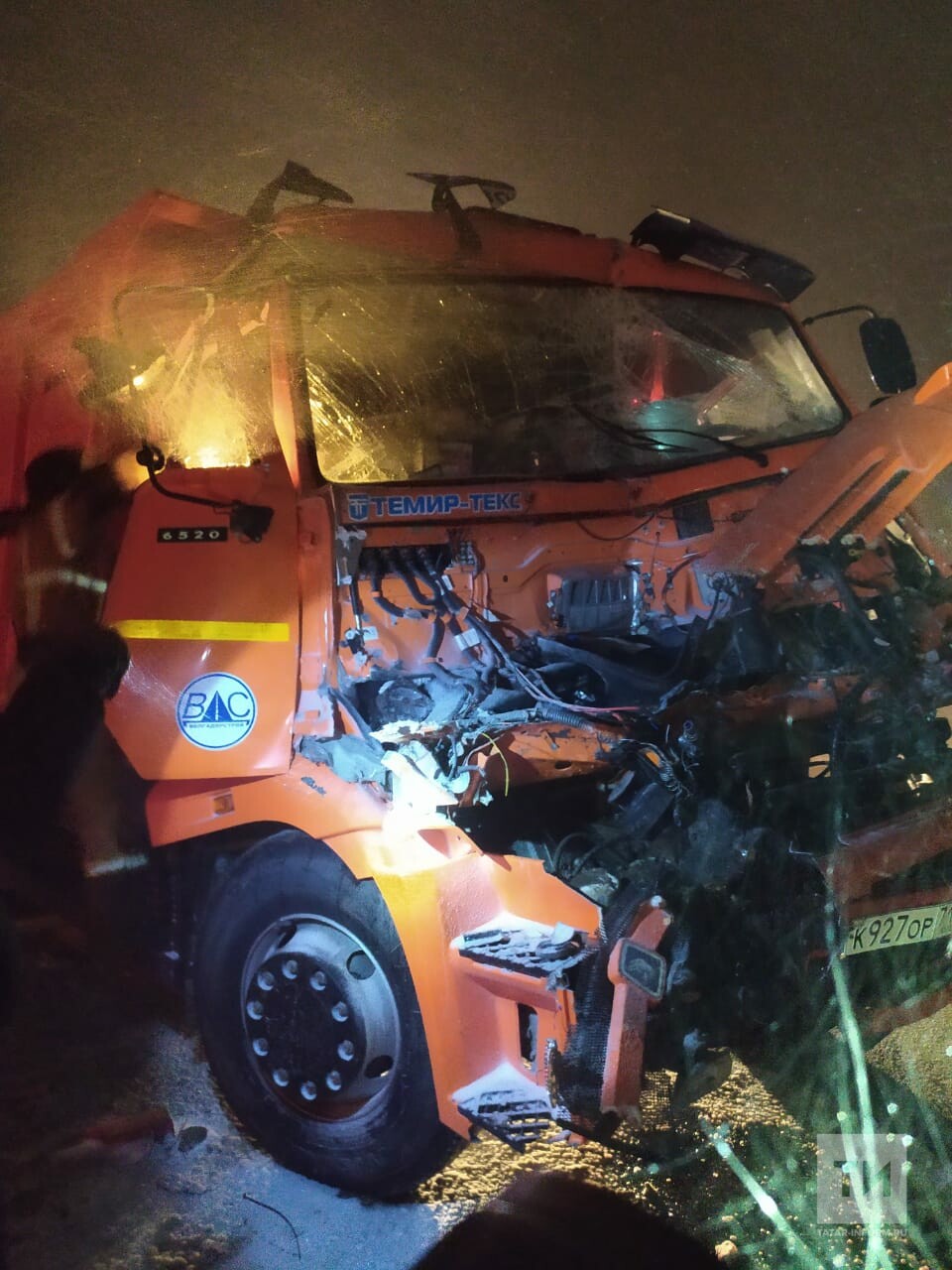 По словам очевидцев, кабину «КАМАЗа» из-за столкновения смяло, выбраться из нее водителю помогли спасатели.