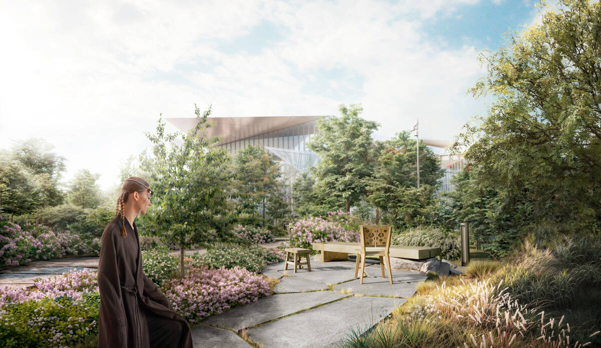 Со стороны воды вдоль театра расположатся «зрительные» зоны. Здесь же появится открытая театральная сцена, предназначенная для уличных выступлений трупп театра и событий иного формата. Вокруг сцены появится лес с дорожками из прессованного настила — они прокладываются так, чтобы оставить большинство участков леса нетронутыми.
