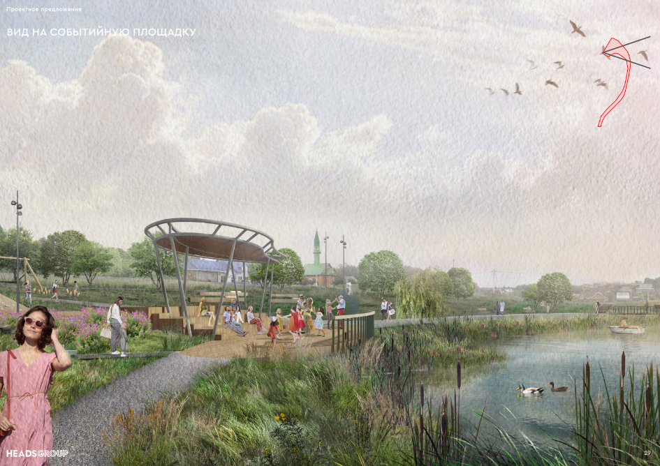 В центральной части парка должна разместиться событийная площадка. Зрительские места организованы в виде амфитеатра, для защиты от солнца предусмотрена пергола.