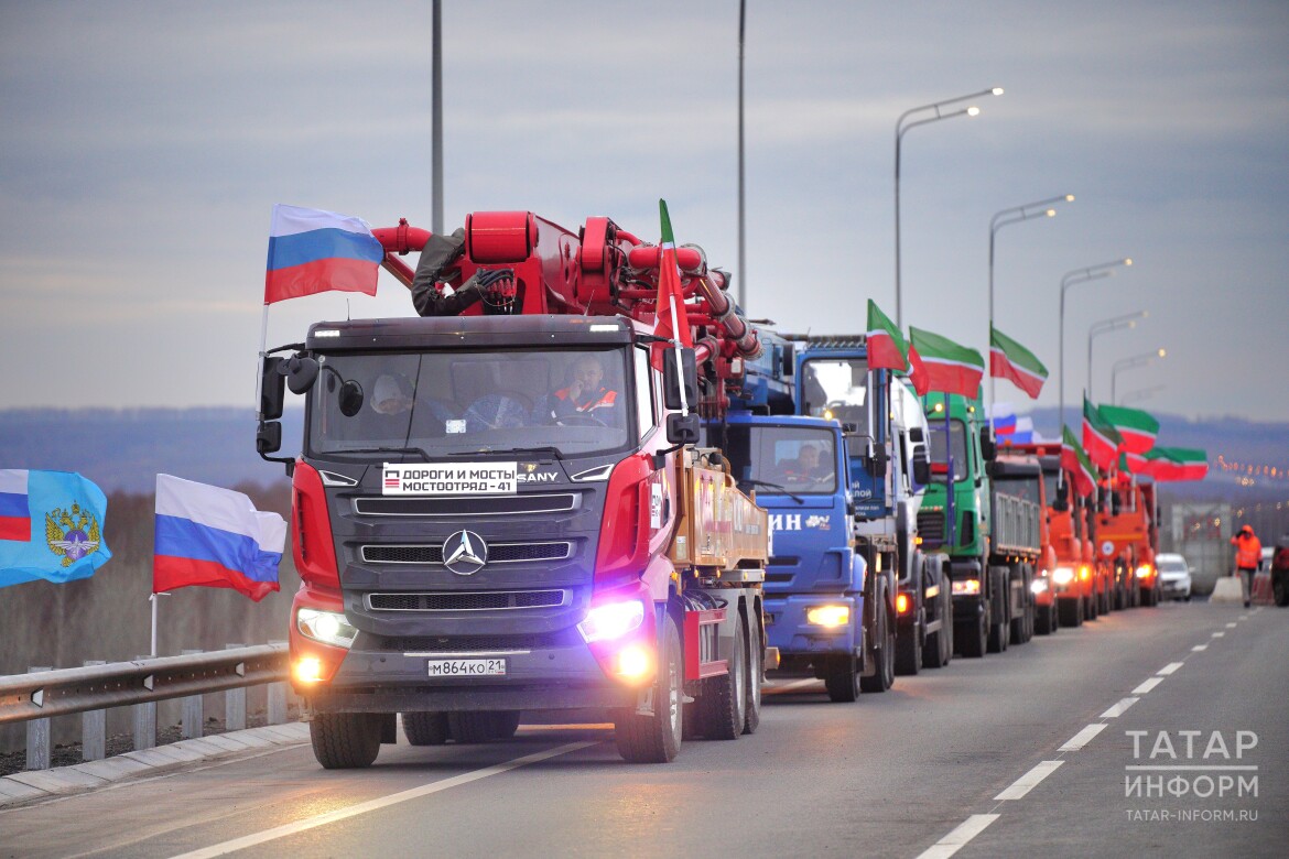 После его слов, по новому мосту проехала колонна КАМАЗов. Автомобили проехали под торжественную музыку, свои сигналы и сигналы автомобилей на соседнем мосту.