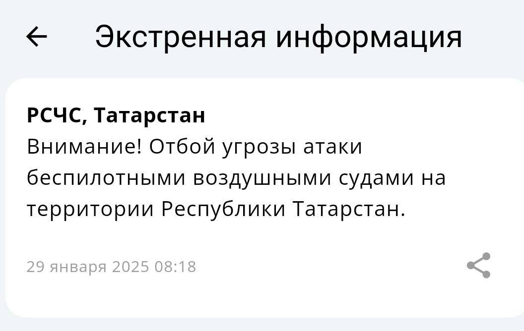 Первое уведомление о возможной атаке в республике поступило сегодня в 00:34. Повторная опасность атаки БПЛА на территории республики была объявлена в 03:30.