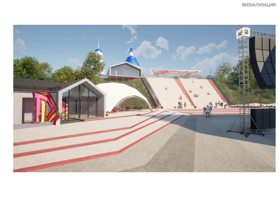 Проект предполагает возведение смотровой площадки с перголой, амфитеатра на 500 мест и административно-бытового корпуса. На территории расположится сцена с шатром и гримерныии. Предусмотрена и парковка.