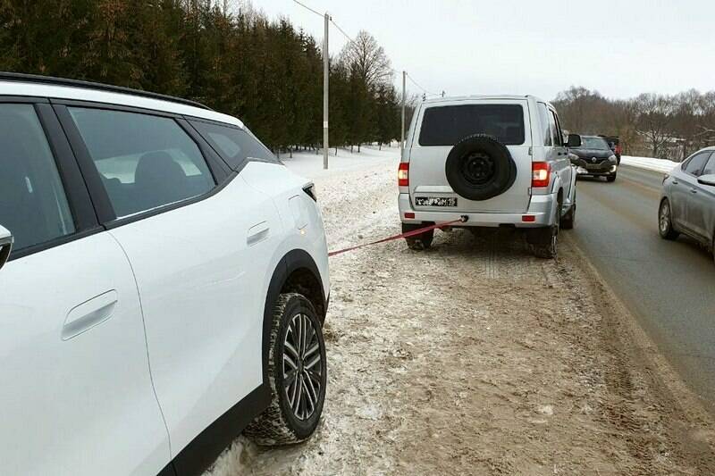 Росгвардейцы остановились и сначала попытались вытолкнуть автомобиль вручную, однако это не помогло. Тогда они закрепили трос между служебным внедорожником и застрявшей иномаркой и вытянули ее на проезжую часть.