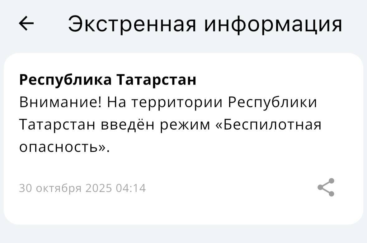 В Татарстане с 4.14 утра действует режим беспилотной опасности. Оповещение пришло в мобильном приложении МЧС России.