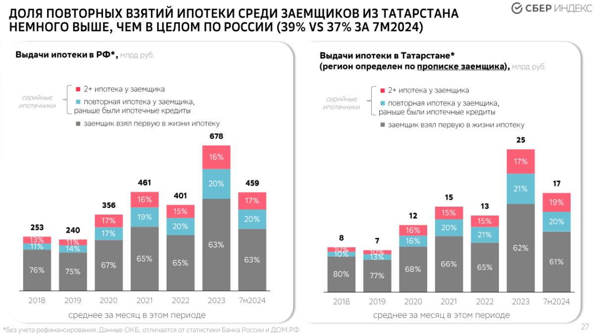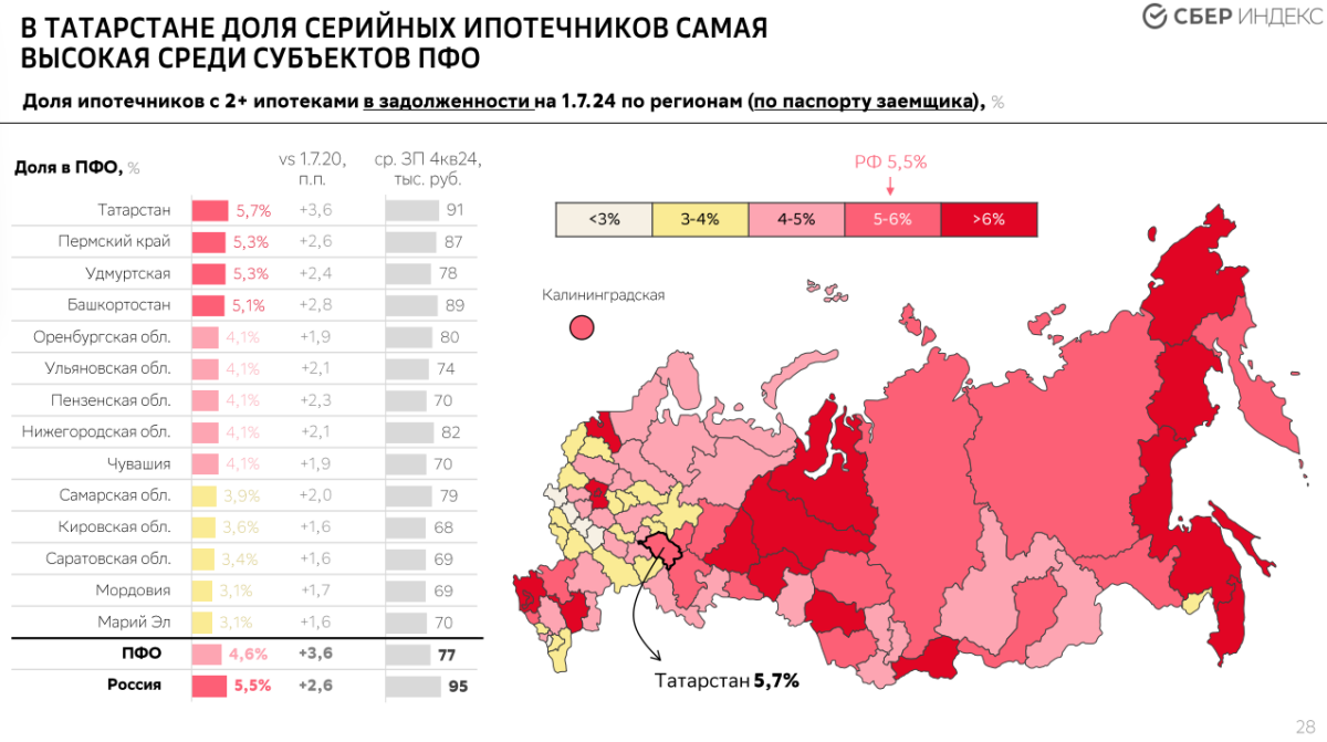 Также на 1 июля 2024 года Татарстан занимает первое место среди регионов Приволжского федерального округа (ПФО) по доле заемщиков, имеющих две и более ипотеки в задолженности. Этот показатель составил 5,7%.