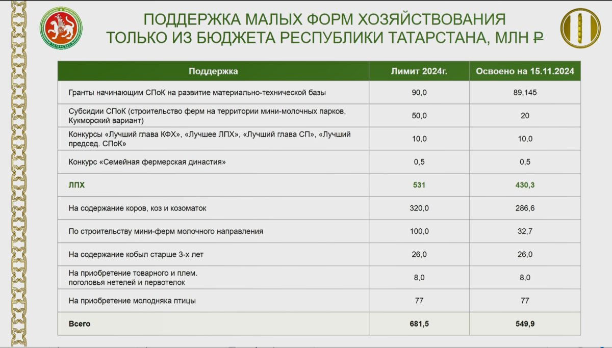 В свою очередь по девяти мероприятиям республиканской поддержки малых форм хозяйствования предусмотрено выделение 681 млн рублей, доведено 550 млн рублей — 81%.