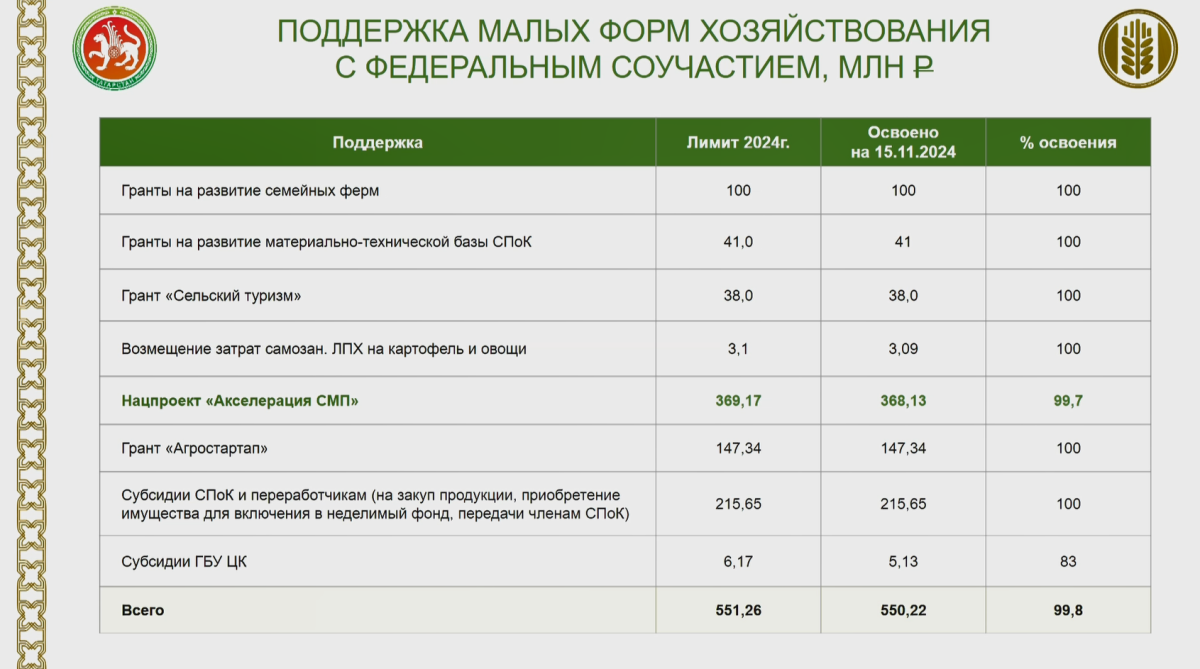 «Низкий процент доведения по личным хозяйствам связан с длительным простоем системы „Моя субсидия“ ввиду перевода сервиса на единую цифровую платформу <…>. Сейчас все остатки доводим, прошу глав муниципальных районов по неосвоенным статьям оказать содействие в подаче заявок граждан. Это субсидии на содержание дойного стада, строительство мини-ферм», — пояснил Зяббаров.