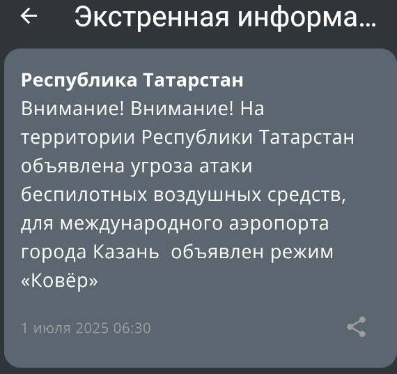 При этом в международном аэропорту Казани из-за «угрозы атаки беспилотных воздушных средств» действует режим «Ковер».