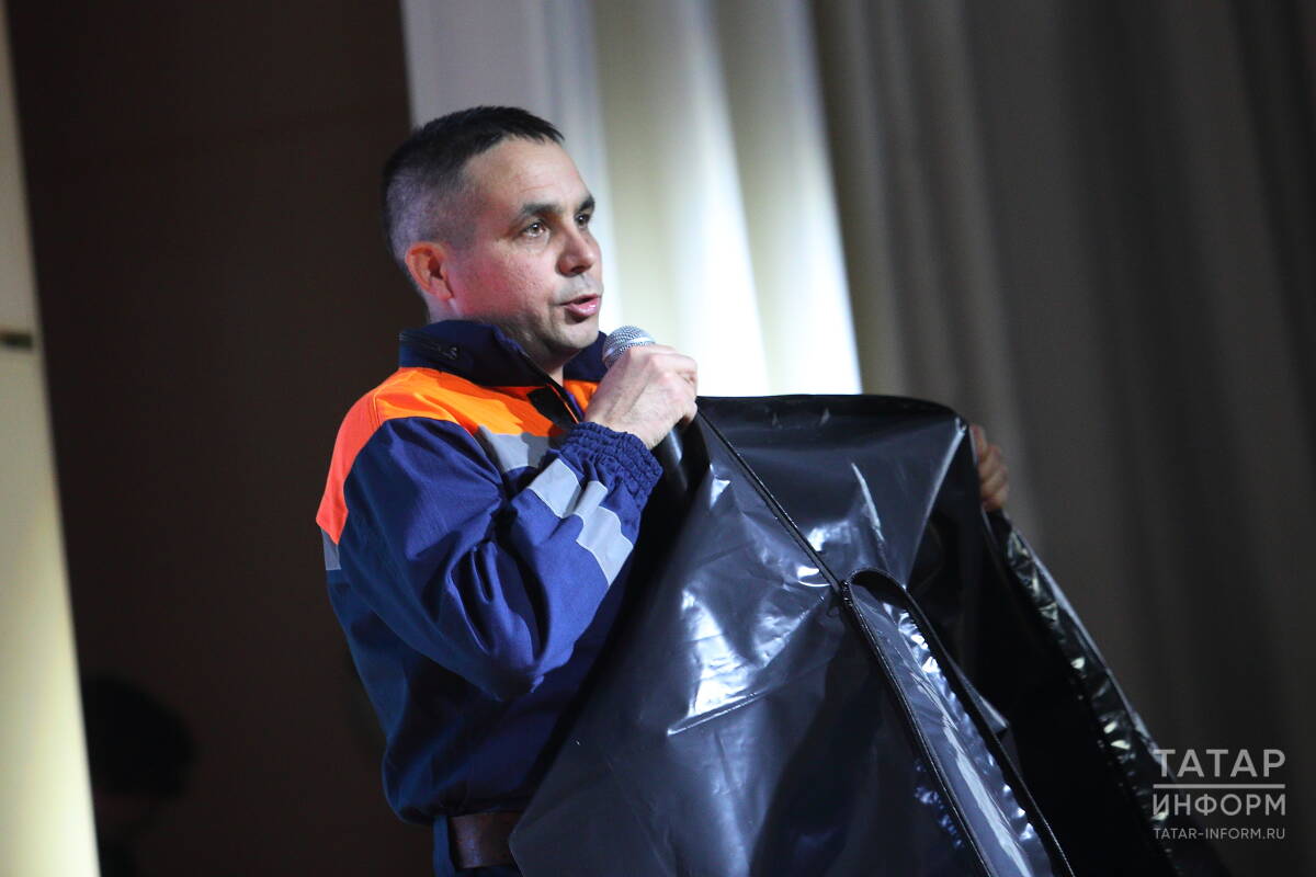 На лицах студентов вновь появилась печаль – после инвалидного кресла на сцену вынесли мешки для трупов. Следом вышел спасатель первого класса поисково-спасательной службы Татарстана Ильдар Асхадуллин.