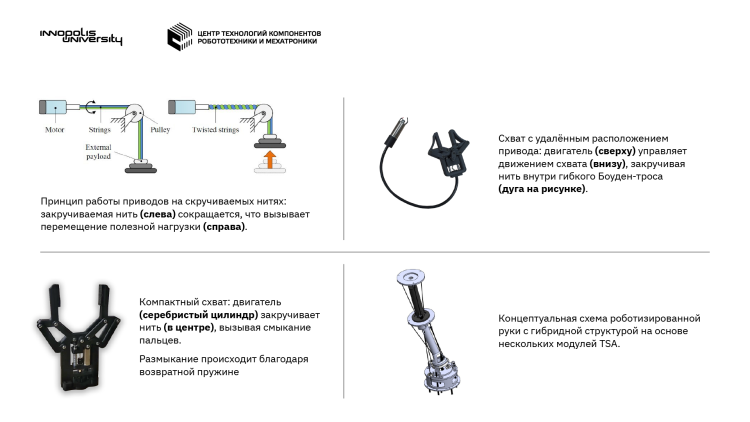 «Данный тип приводов имеет ряд уникальных преимуществ, которые делают его привлекательным при разработке и проектировании всевозможных робототехнических систем – легкий вес, высокие развиваемые усилия, точность, гибкость при проектировании и установке», – пояснил Игорь Гапонов, руководитель Лаборатории мехатроники, управления и прототипирования Центра компетенций НТИ по направлению «Технологии компонентов робототехники и мехатроники» на базе Университета Иннополис.
