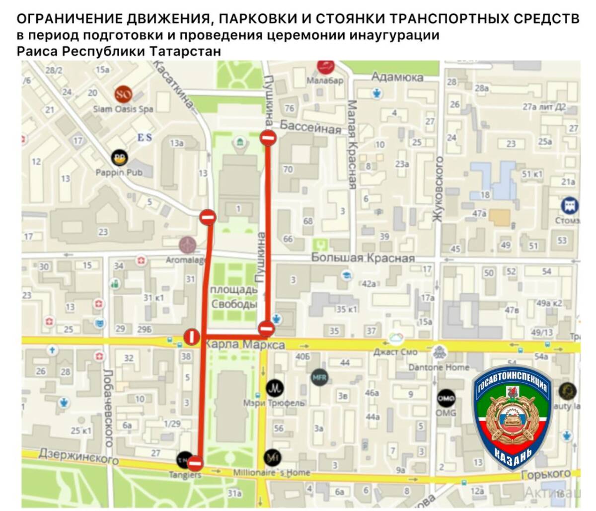 В Вахитовском районе Казани ограничат движение во время инаугурации Раиса РТ