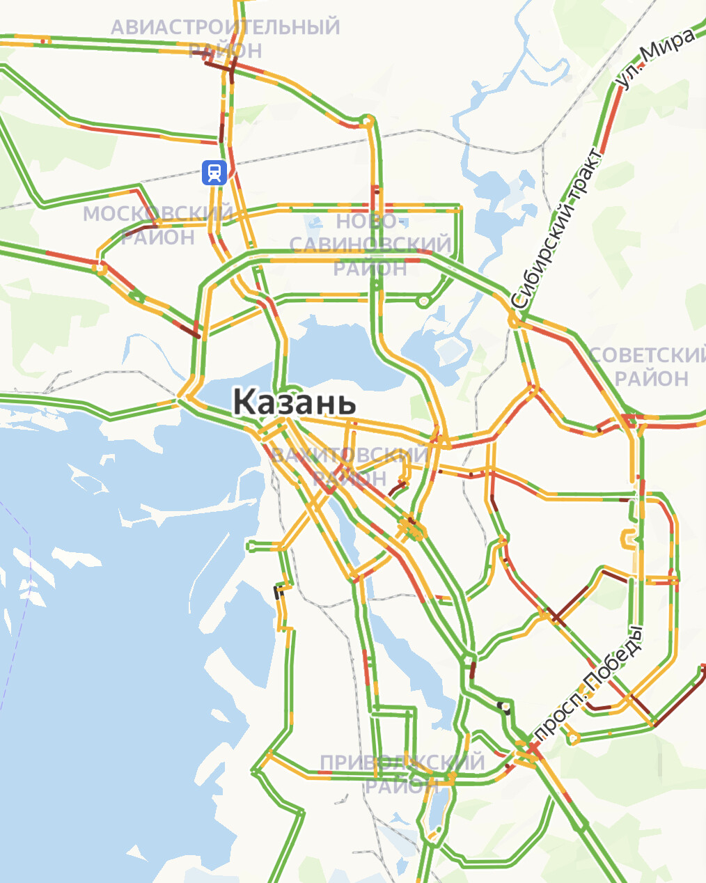 По данным сервиса «Яндекс.Пробки» самое затруднённое движение в центре города, а также на улицах Аделя Кутуя, Ершова, Родины, Комиссара Габишева, а также на проспектах Победы и Ямашева.