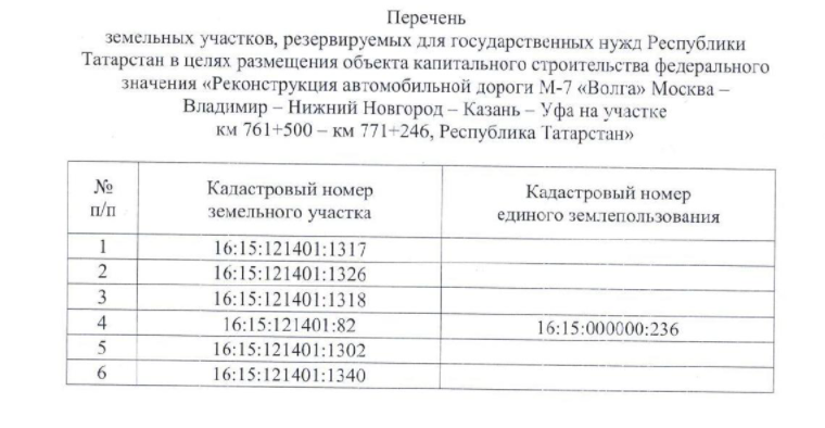 «Зарезервировать для государственных нужд РТ в целях размещения объекта капитального строительства федерального значения „Реконструкция автодороги М-7 „Волга“ <...> сроком на три года земельные участки <...>, расположенные на территории Верхнеуслонского района», — сообщается в документах.