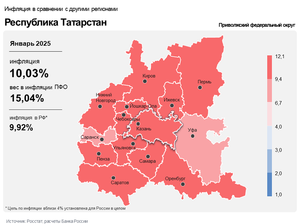 Годовая инфляция в Татарстане в январе разогналась до 10,03%, что выше, чем в среднем по России в целом (9,92%) и по Приволжскому федеральному округу (9,97%). Об этом сообщает Центробанк РФ.