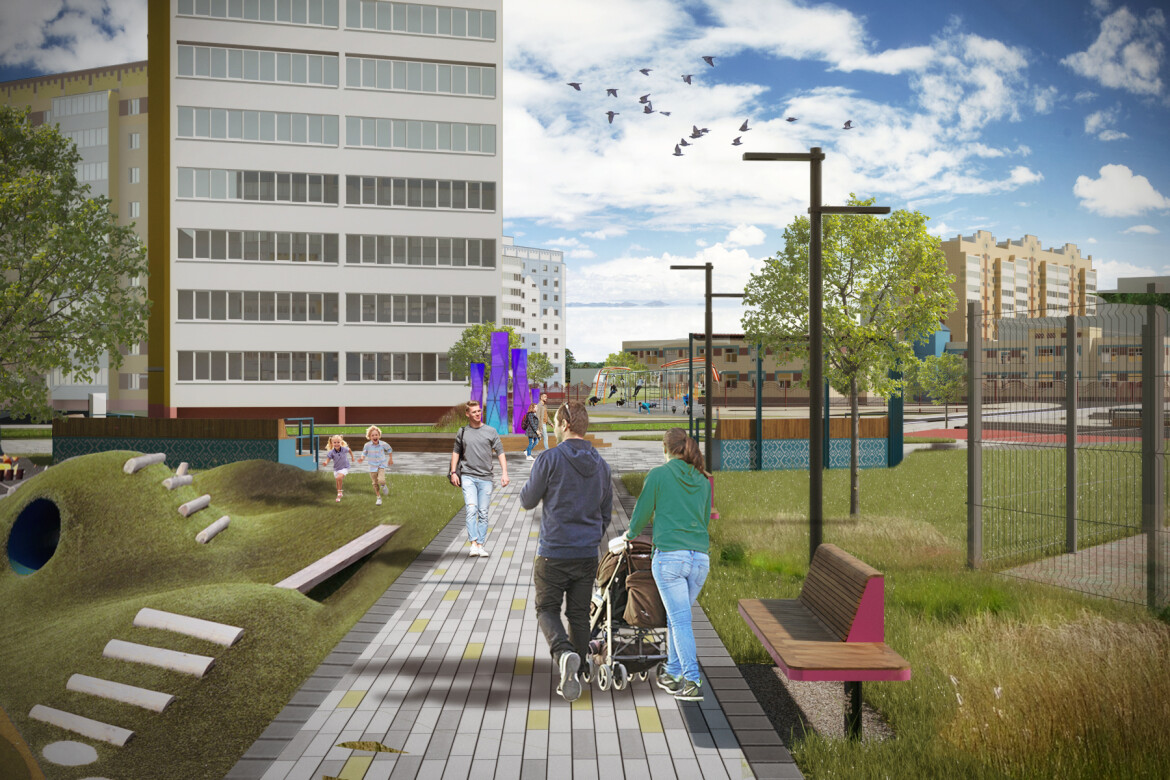«Проект благоустройства микрорайона „Западные ворота“ нацелен на создание внутри квартала комфортной среды. Ядром проекта стал пешеходный бульвар вокруг инженерной школы. Он включает в себя зоны рекреации, праздничную зону с амфитеатром и сценой для локальных событий, детскую площадку, спортивную зону и идентичные арт-объекты, связанные с историей места и города. Бульвар связывает школу, детские сады и жилые дома в пешеходную безбарьерную среду без проездов автотранспорта, что создает комфортные и безопасные условия», — поделился с ИА «Татар-информ» Виталий Волков — директор архитектурной компании Miriada Group, которая разработала данный проект.
