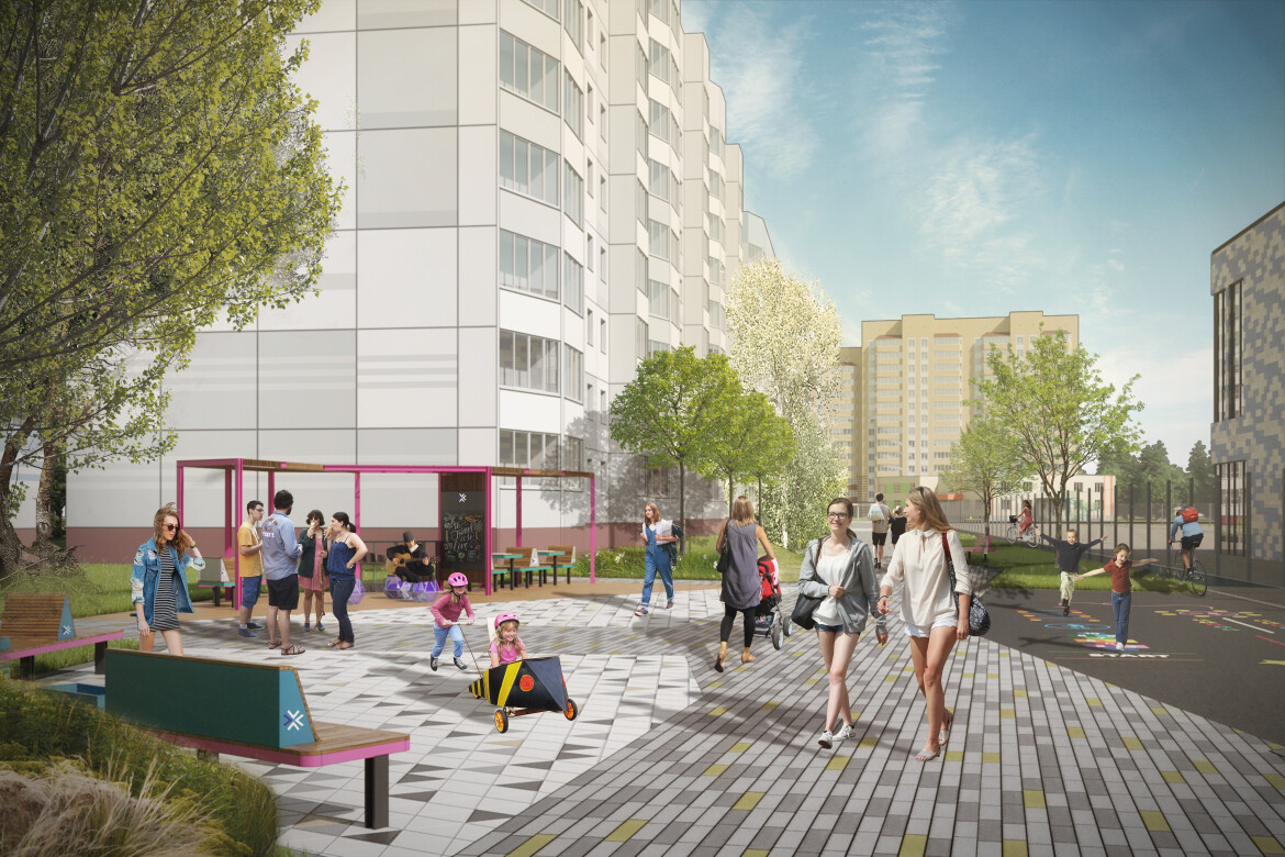 «Все малые архитектурные формы выполнены с учетом дизайн-кода проекта: лавки, навесы, амфитеатр, урны. Внутри квартала организована закольцованная велодорожка с выходом на городскую велодорожную сеть», — добавил Волков.