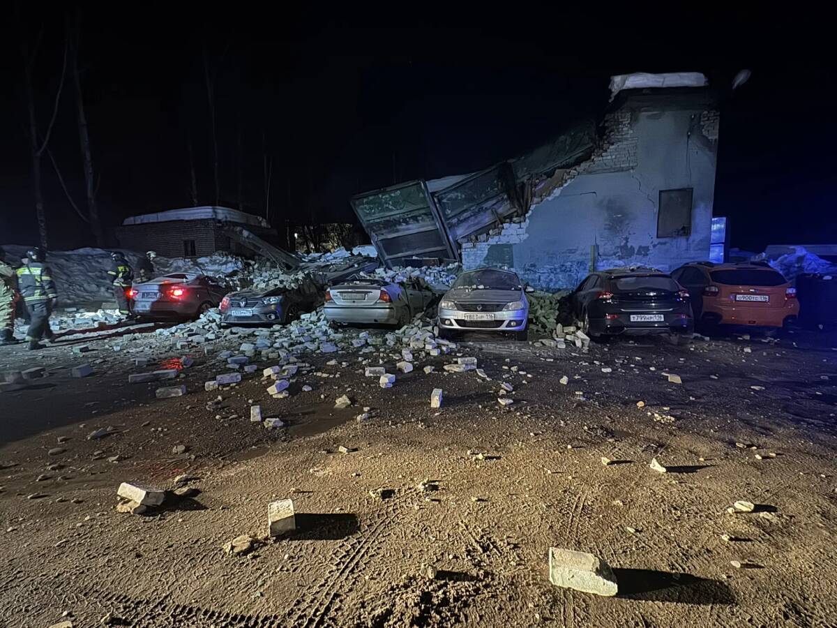 Обломки крыши и стены разлетелись вокруг, повреждения получили шесть припаркованных рядом автомобилей.