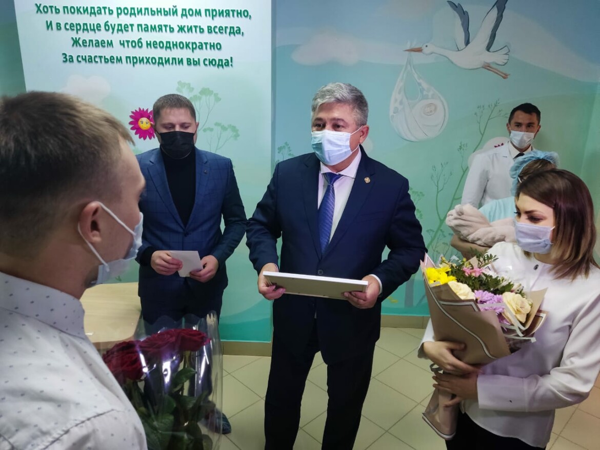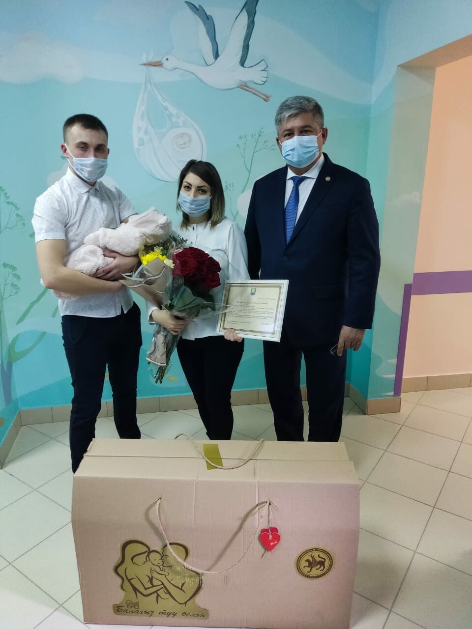 Сергея и Александру Семеновых на выписке поздравили мэр Зеленодольска Михаил Афанасьев и исполняющий обязанности главврача Зеленодольской центральной районной больницы Эльмир Гатин.