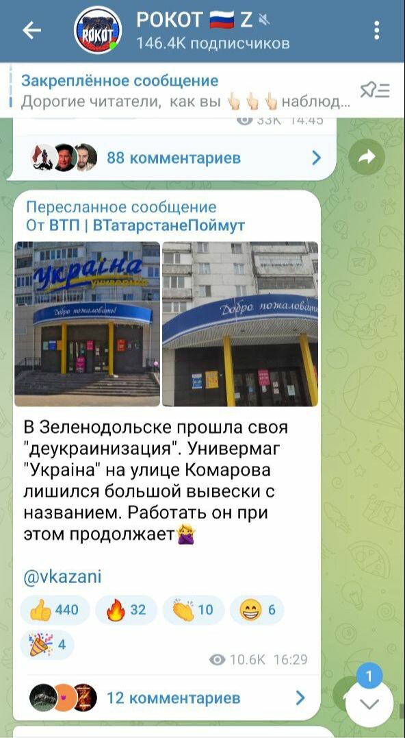 Новость о снятой с универмага вывеске появилась на страницах федерального телеграм-канала РОКОТ, в подписчиках у которого почти 150 тыс. человек.