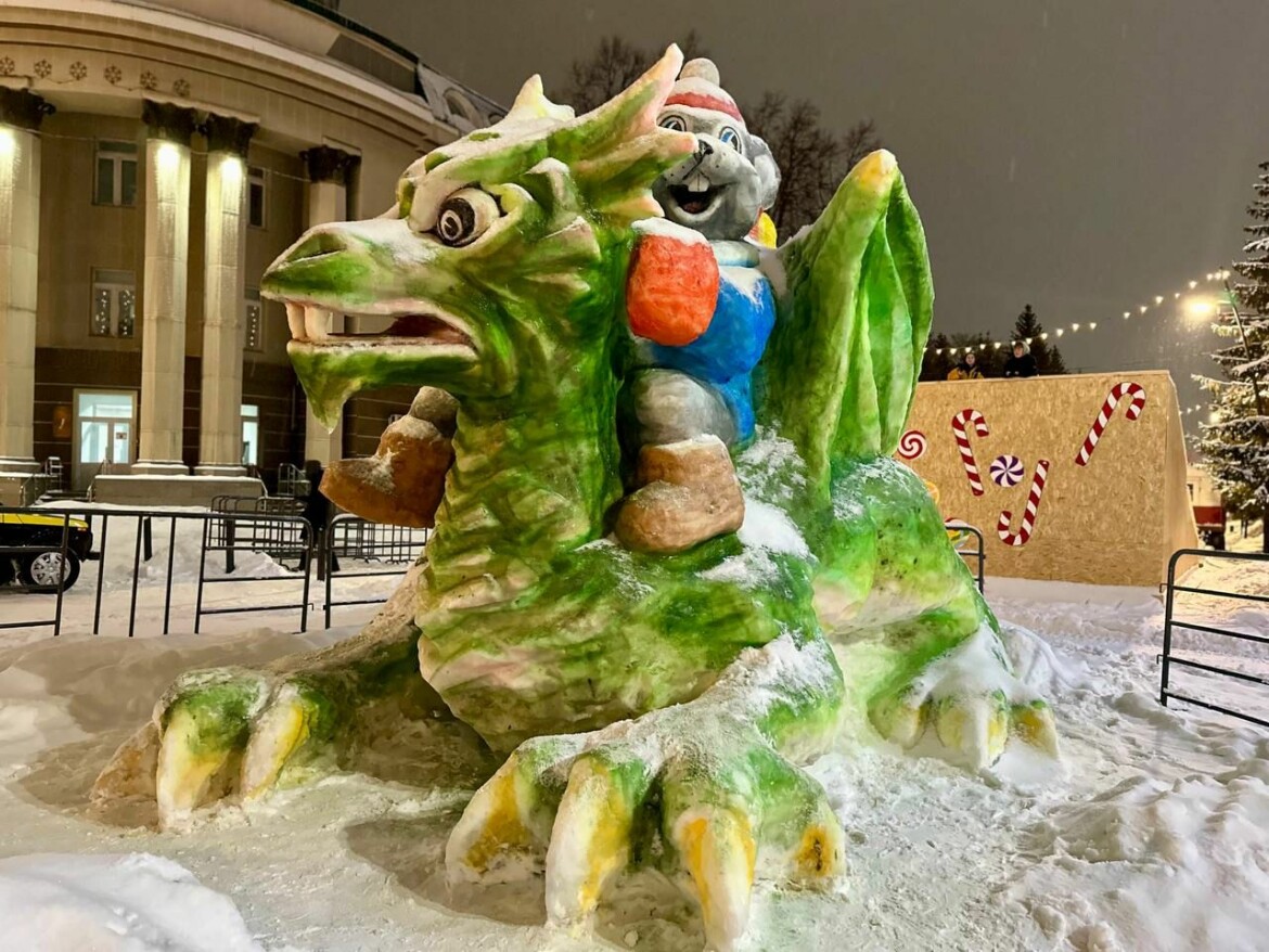 Главным украшением новогоднего городка стала снежная фигура дракона высотой 4 метра – это символ наступающего года.